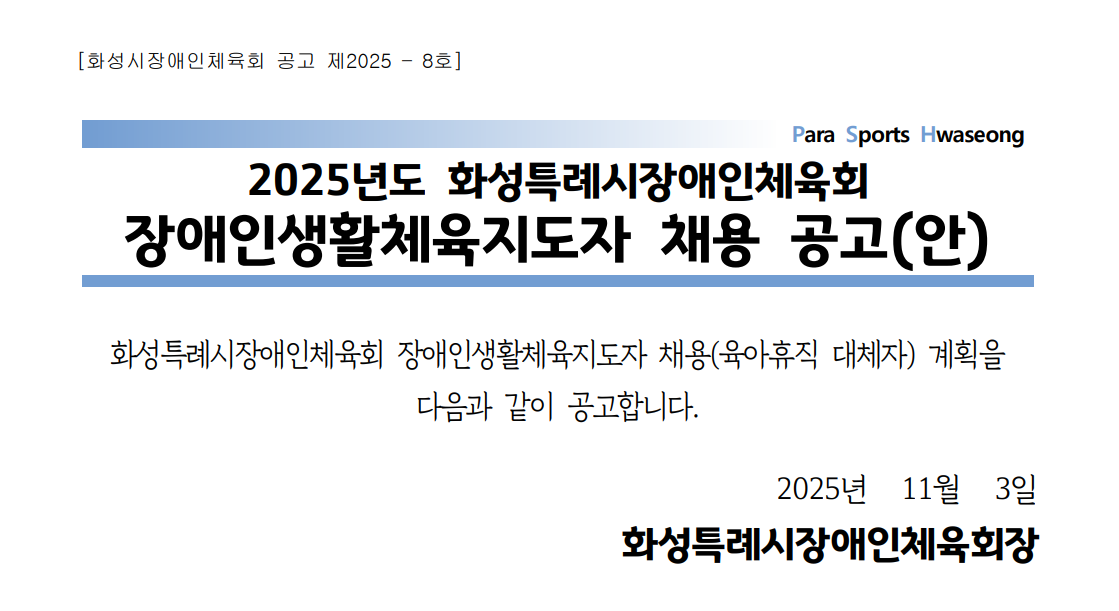 2025년 화성특례시장애인체육회 장애인생활체육지도자 채용 공고(안)[정정]