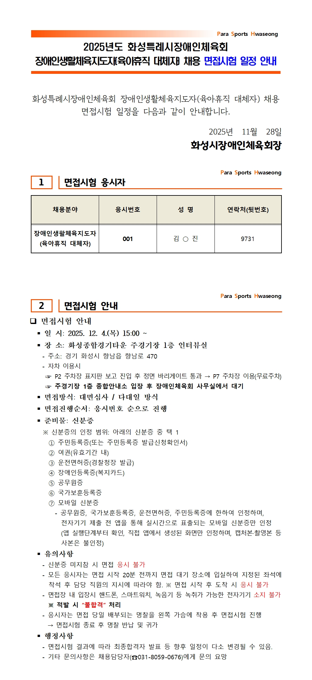 2025년 화성특례시장애인체육회 장애인생활체육지도자 채용 면접시험 안내