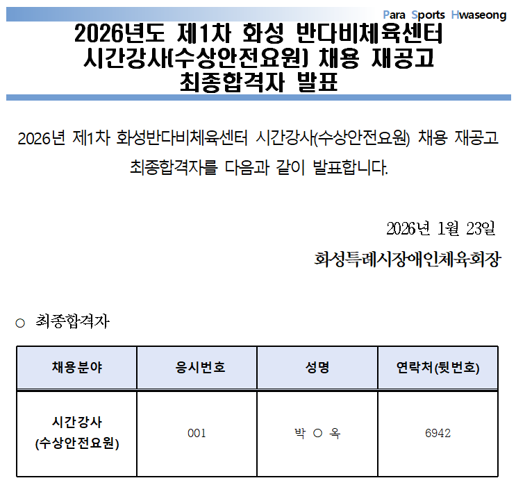 2026년도 제1차 화성반다비체육센터 시간강사(수상안전요원) 채용 재공고 최종합격자 발표