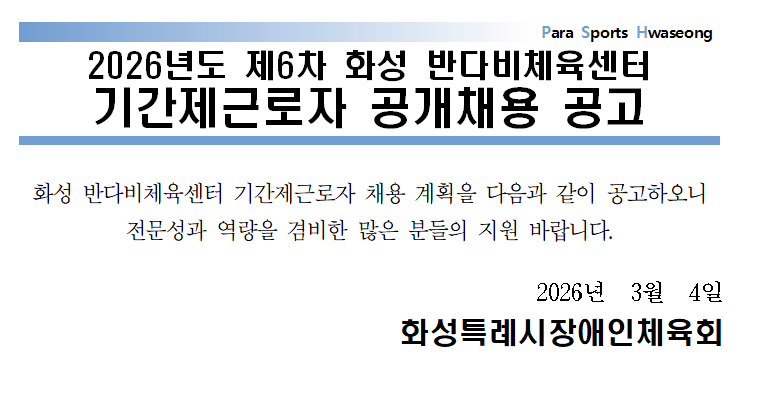 2026년 제6차 화성 반다비체육센터 기간제근로자 공개채용 공고