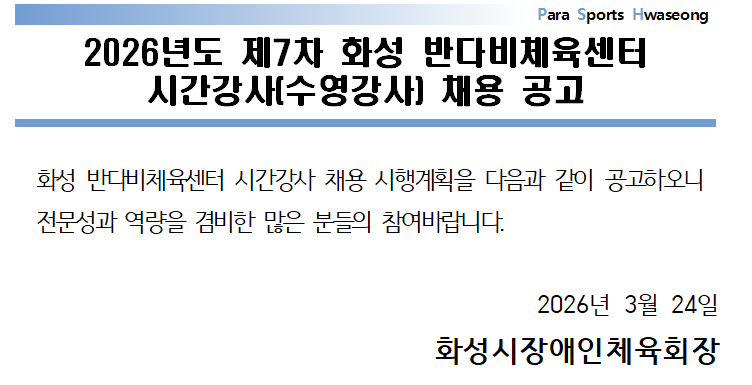 2026년도 제7차 화성 반다비체육센터 시간강사(수영강사)채용 공고