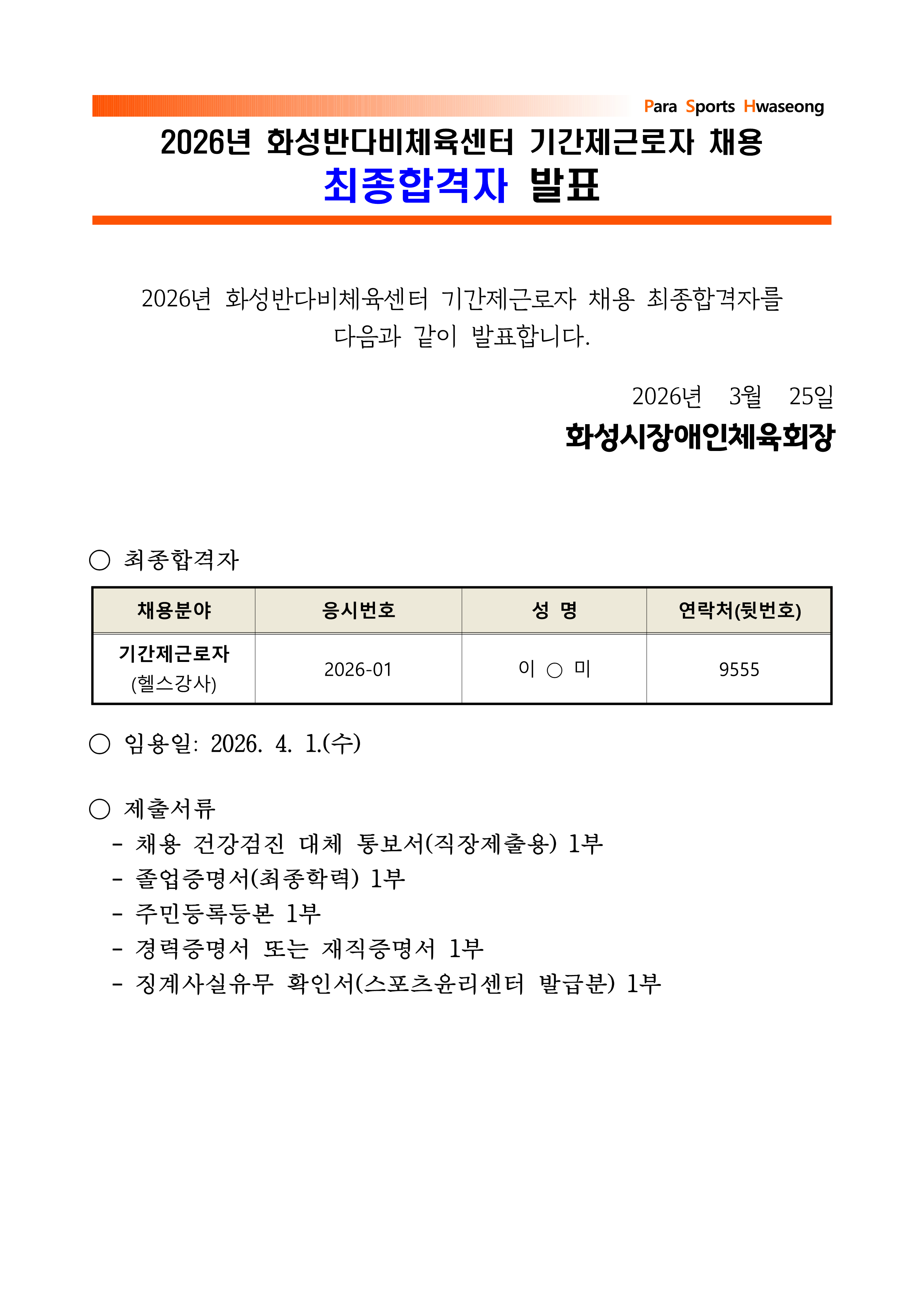 2026년 화성반다비체육센터 기간제근로자 채용 최종합격자 발표
